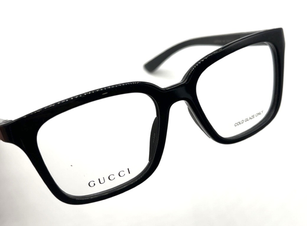 Monture noire épaisse en acétate, de forme rectangulaire légèrement arrondie, offrant un style à la fois sobre et sophistiqué. Le logo Gucci est discrètement visible sur le verre, soulignant le caractère haut de gamme et la qualité de fabrication. Idéales pour un look chic au quotidien.
