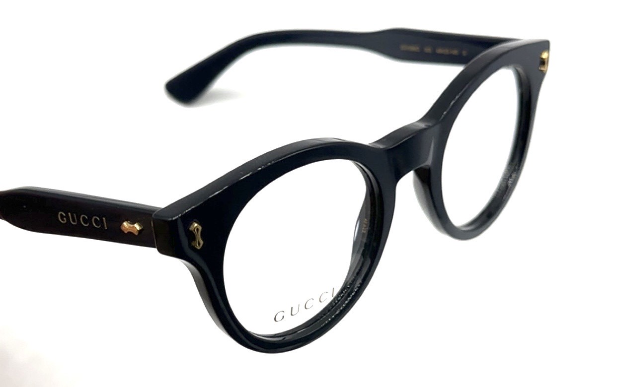 Lunettes de vue Gucci au design pantos arrondi en acétate noir, avec une monture cerclée élégante et des détails métalliques dorés sur les charnières, signature de la maison. Le style est chic, intemporel et raffiné, avec une épaisseur équilibrée qui apporte du caractère sans excès.