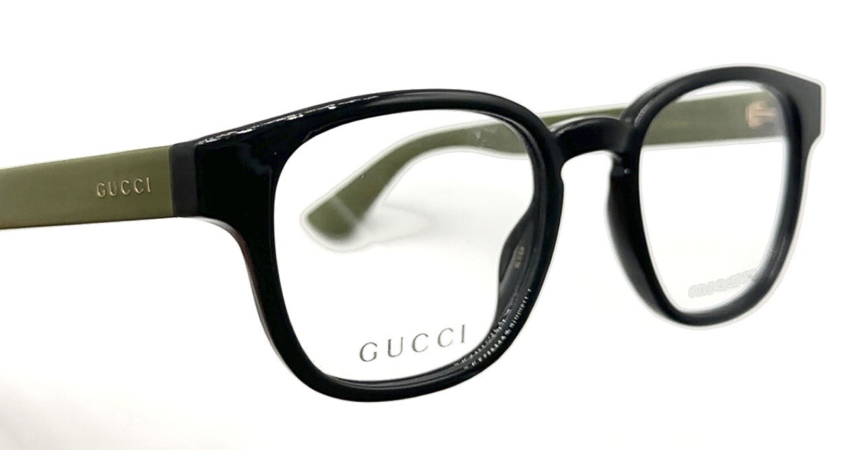 Monture de lunettes Gucci en acétate noir brillant sur la face avant, avec des branches vert olive mat apportant un contraste élégant et moderne. La forme est légèrement arrondie avec une touche rectangulaire, offrant un design sophistiqué mais sobre. Logo GUCCI discret à l’intérieur des branches, fabrication Made in Italy, finitions soignées et style premium. Convient aussi bien à un usage optique quotidien qu’à un look mode affirmé.
