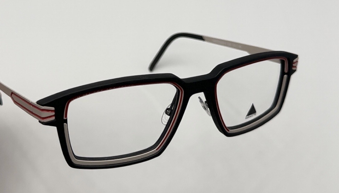 Lunettes à monture rectangulaire noire, avec un liseré rouge et clair à l’intérieur pour un style moderne et élégant. Les branches bicolores avec détails décoratifs ajoutent une touche originale, tandis que les plaquettes transparentes assurent un bon confort.