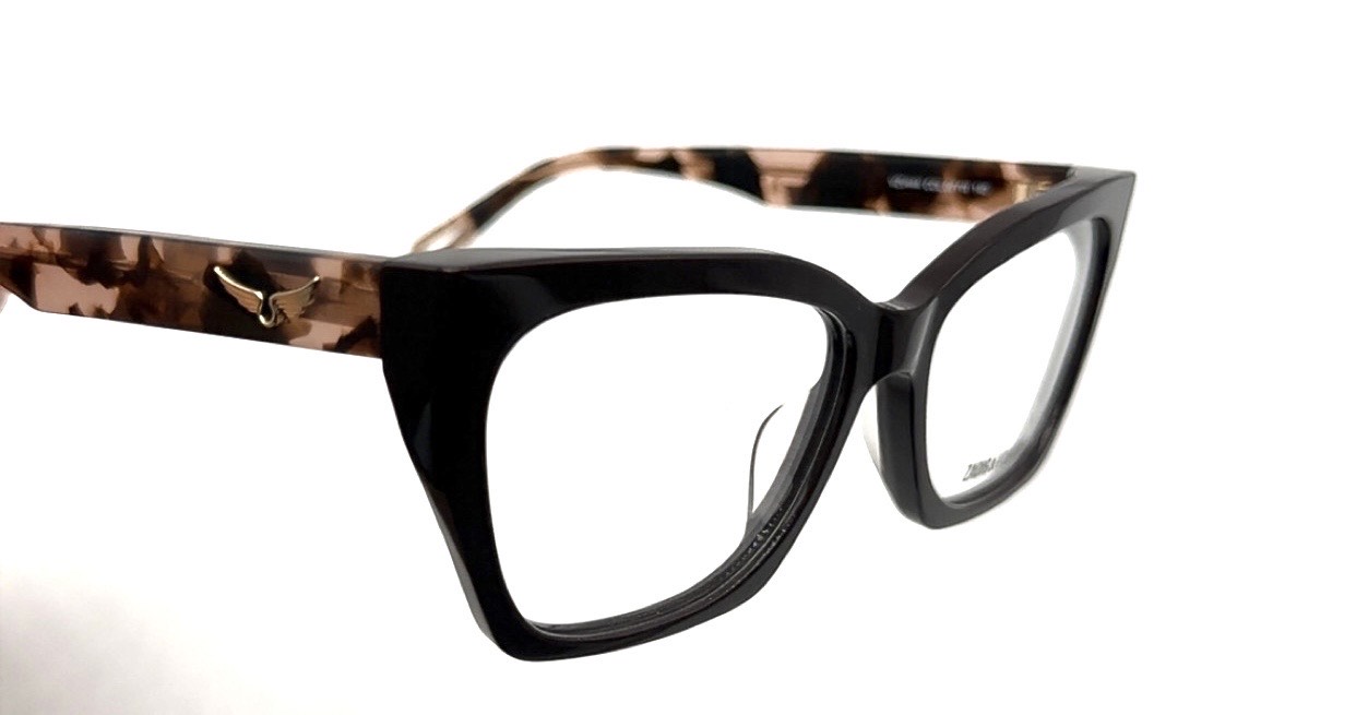Monture Zadig & Voltaire en acétate noir brillant à l’avant, avec une forme rectangulaire légèrement oversize qui apporte du caractère et une allure affirmée. Les branches écaille brun et beige créent un contraste chic et tendance, rehaussé par un détail métallique emblématique de la marque près des charnières. Design moderne, lignes nettes et finitions soignées, idéal pour un style élégant et contemporain.