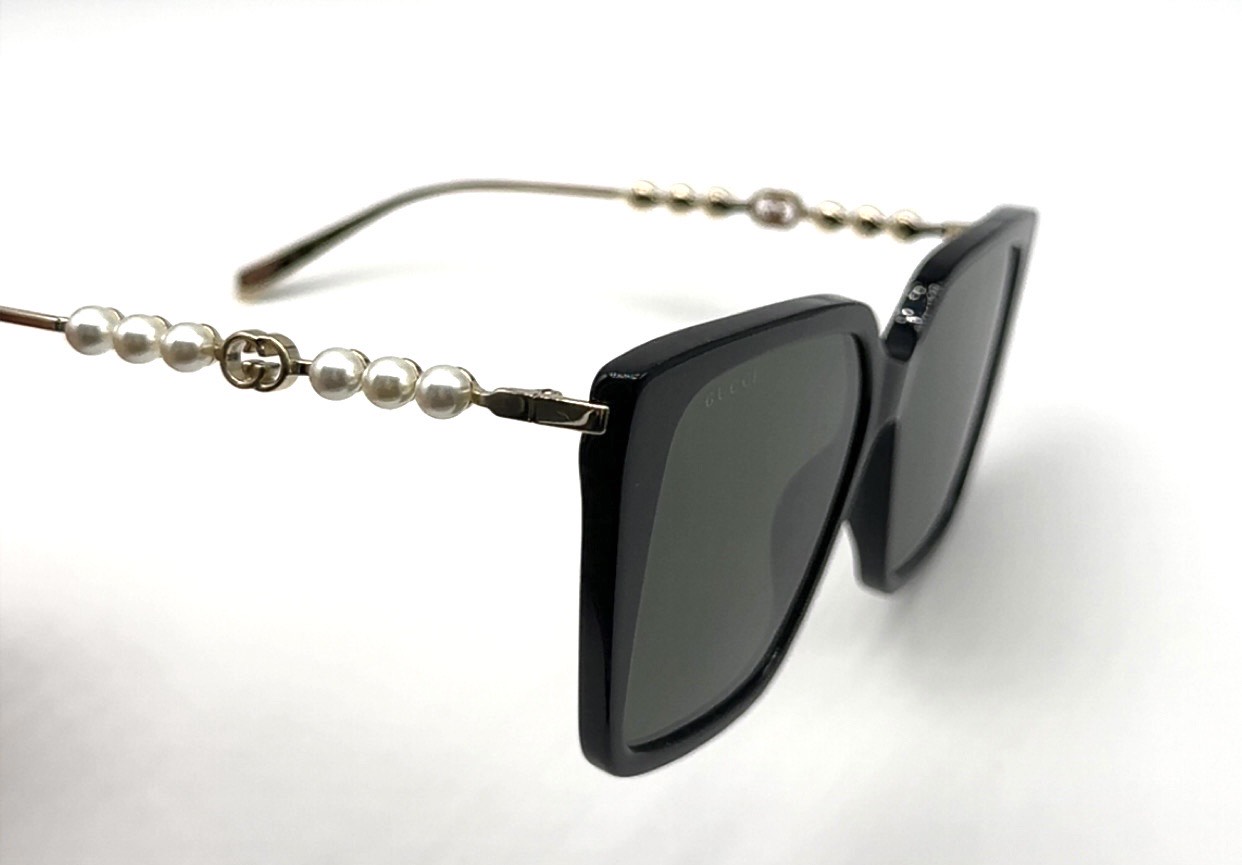 Ces lunettes GUCCI très chic se distinguent par leurs branches dorées ornées de perles raffinées, associées à une face entièrement noire. Un modèle élégant et sophistiqué qui apporte une touche de luxe et d’originalité à votre style.